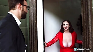 Hot brunette with awesome natural curves in black boulder-holder gets blown and then fucked stiff by a huge dick