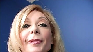 Mature platinum-blonde Nina Hartley sucks a BBC through a gloryhole
