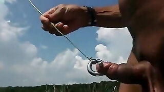 nippleringlover pissing in bottle outdoors - pierced pussy, big labia rings - pierced tits, spread nipple piercings