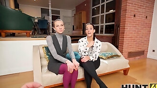 vip4k. доминирующая брюнетка в черных колготках использует большую игрушку, чтобы произвести впечатление на свою девушку